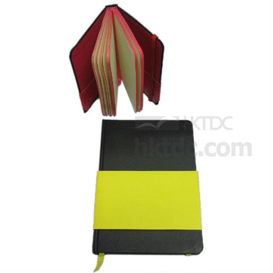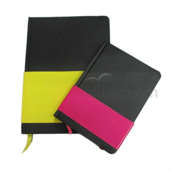 Size:20 x14 cm Material: Black leatherette paper wrap on greyboard for cover;160pp120g wood free paper for text; Printing: 1c/0c printing for the belt; pink color edge Binding: hardcover bound and elastic closure Feature: ribbon book mark