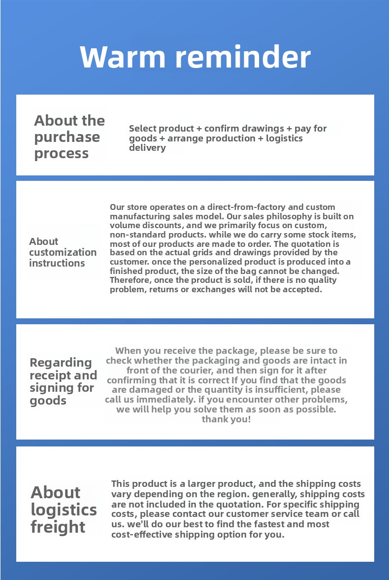 A3:We are honored to offer you sample after the sample cost.If the order reach or exceed behind MOQ quantity ,the fee can be refunded.If not reached behind MOQ quantity, the fee will be taken by  your.