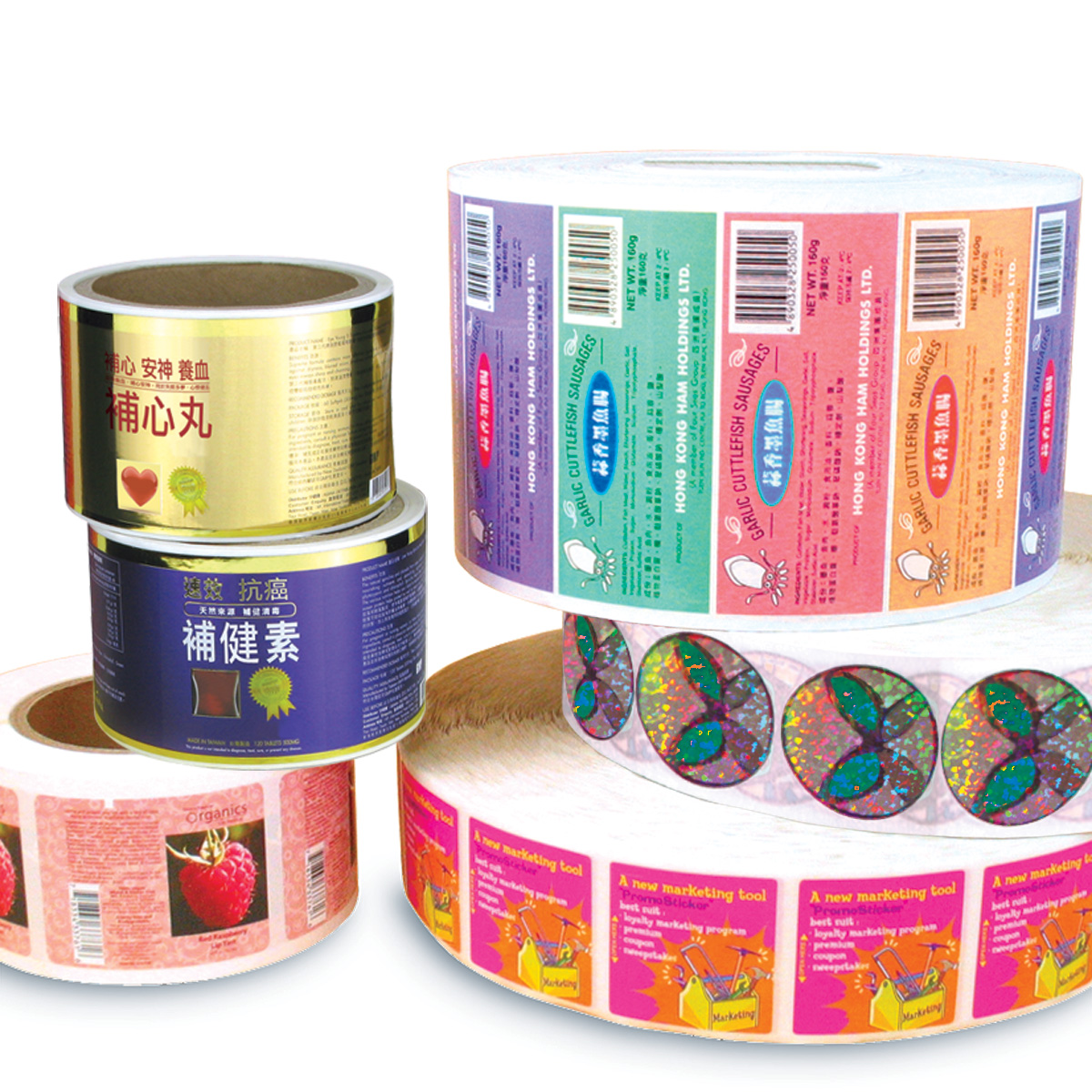 Adhesive printing roll / sheet form sticker label for product promotion and packaging. The labels can be customized with offset printing, digital printing, silkscreen printing and coating techniques available. This printed label is widely used in supermarkets, fashion and gift stores.