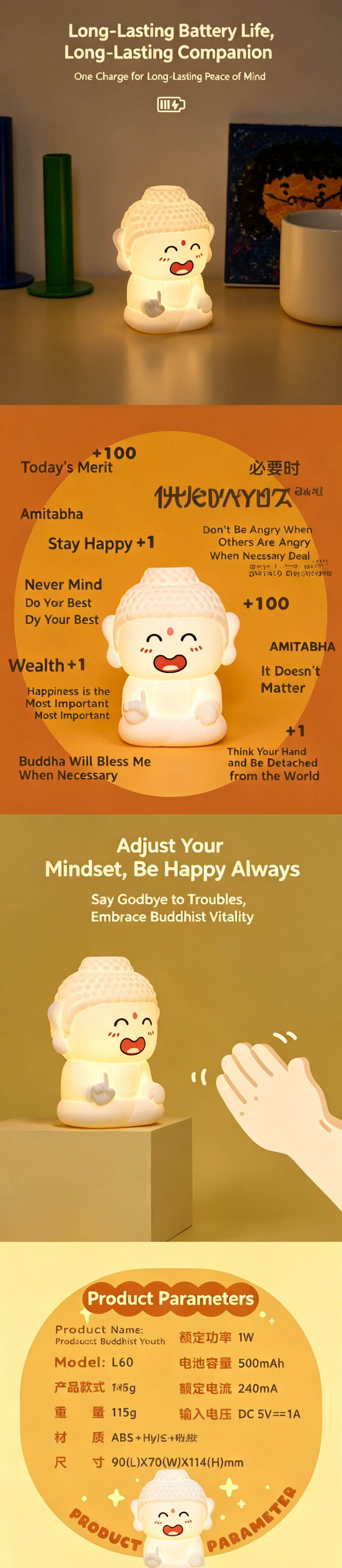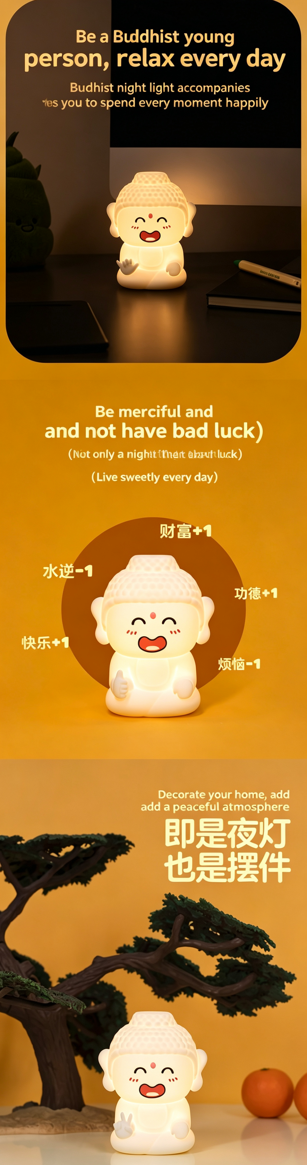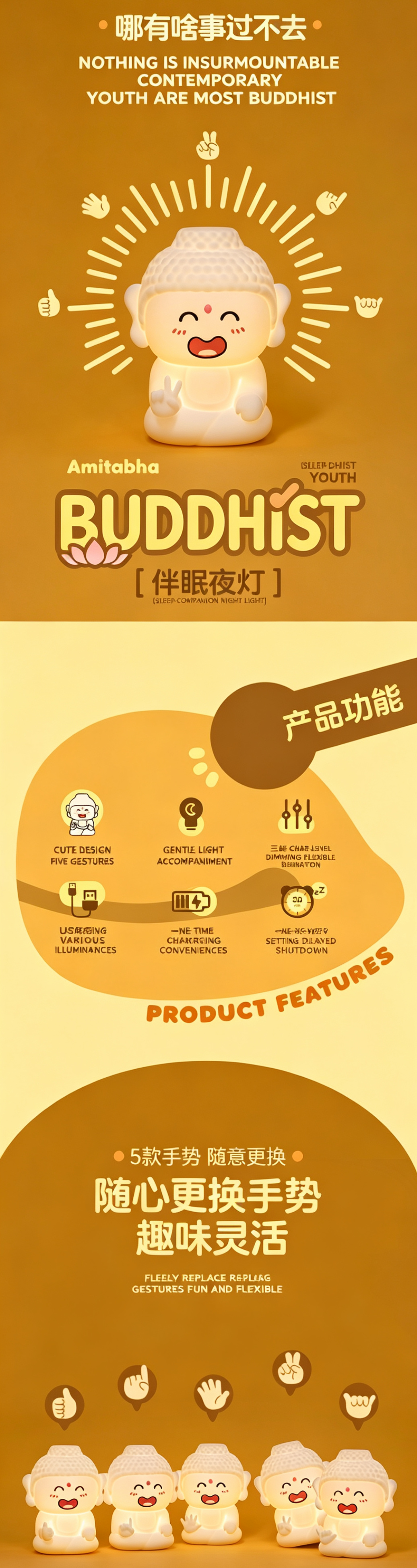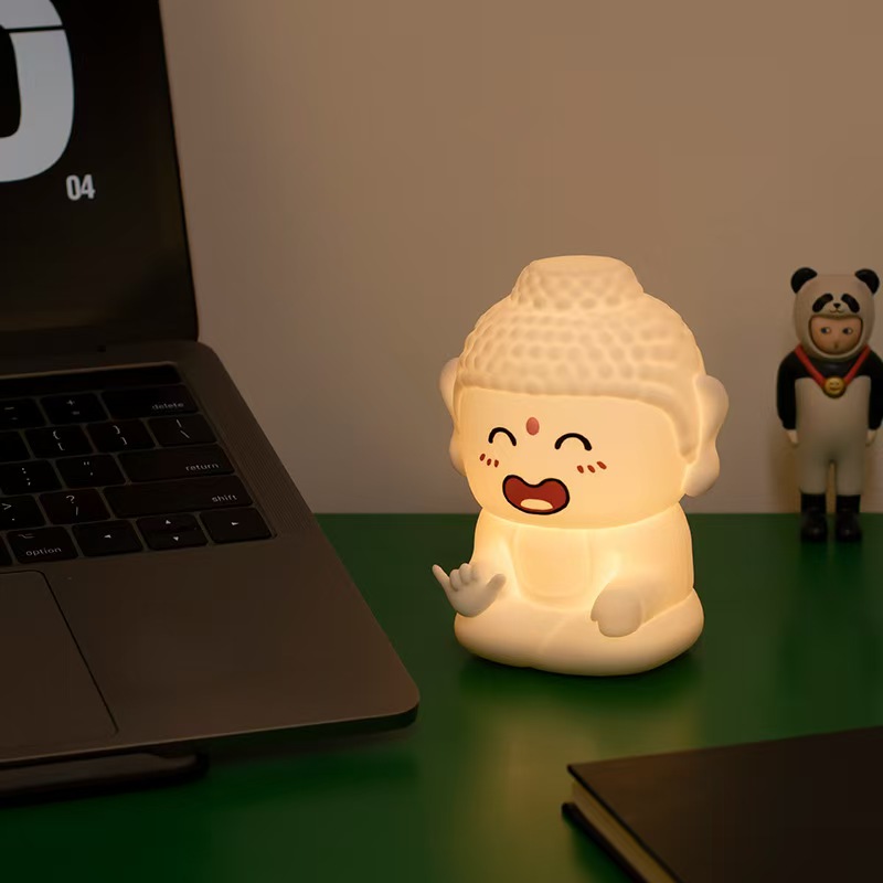 This cute Buddha night light is your perfect zen companion for daily relaxation. With its adorable cartoon design and 5 interchangeable hand gestures, it adds a playful, stress-relieving touch to your bedroom, desk or living room.