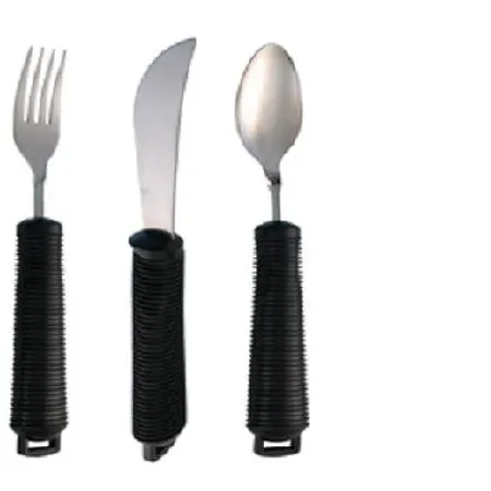 Outlined is a cutlery set comprising a spoon, fork and rocker knife in bendable style for gratifying flexibility. They both showcase a silvery rigid construction and are paired with black rubberized handles. The handles are characterized by corrugated details which promise an extra firm grip.