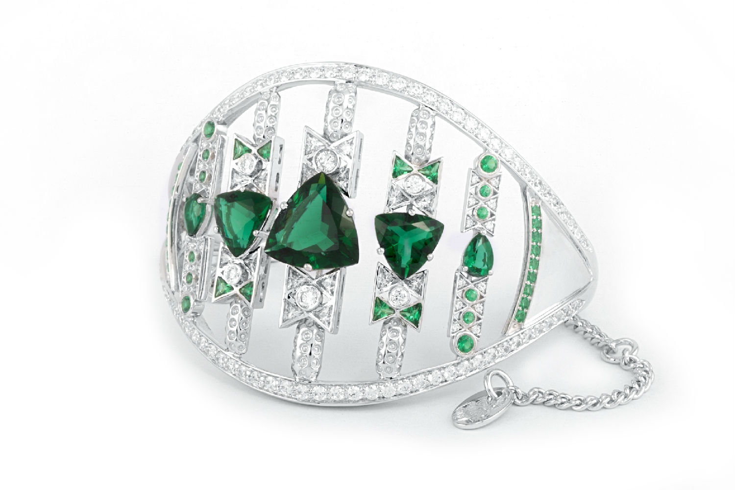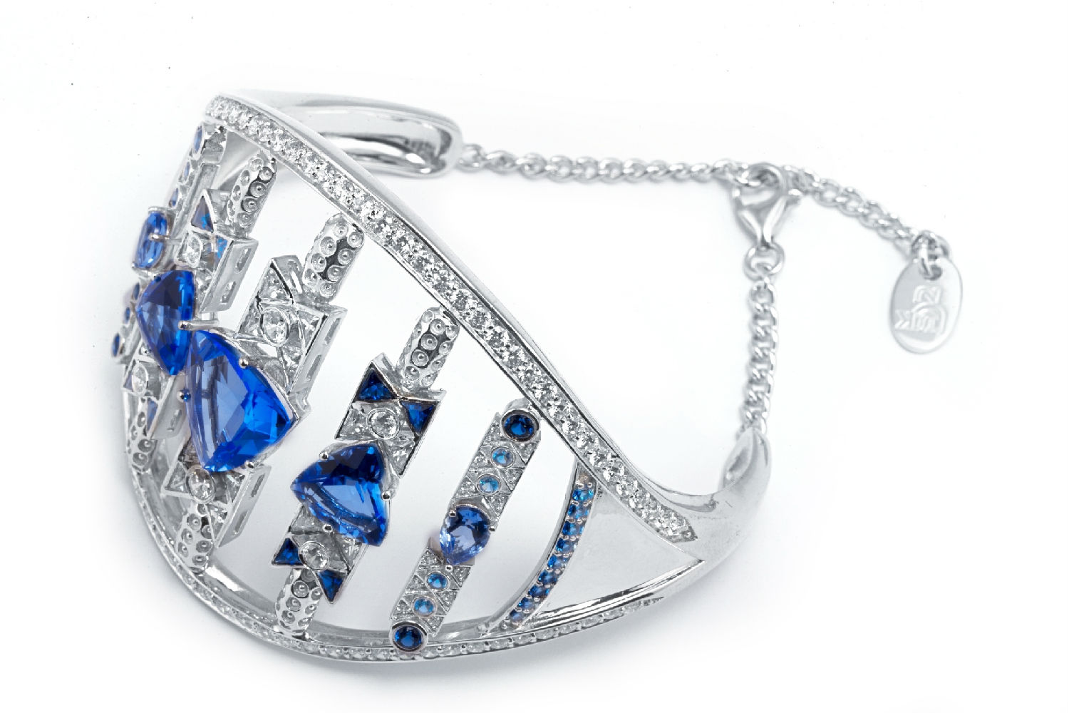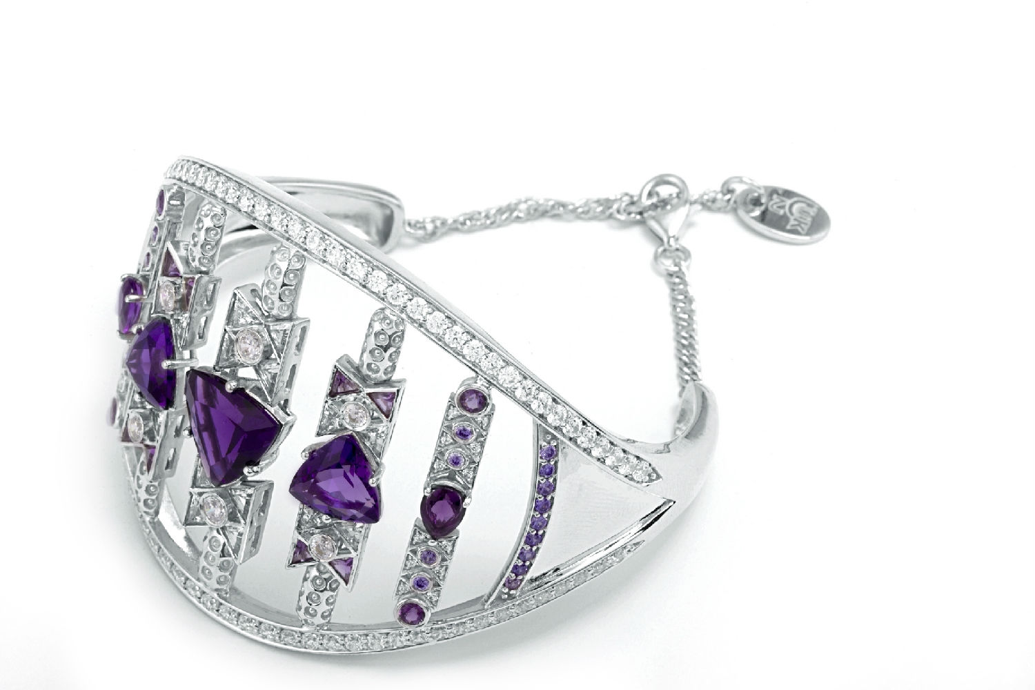 This silver, rhodium plated bracelet has a wonderful open silhouette and is trendy and perfect for all occasions. Ideal for the fashion forward female. This setting also comes in emerald and sapphire.