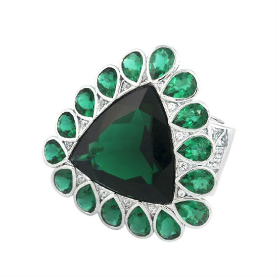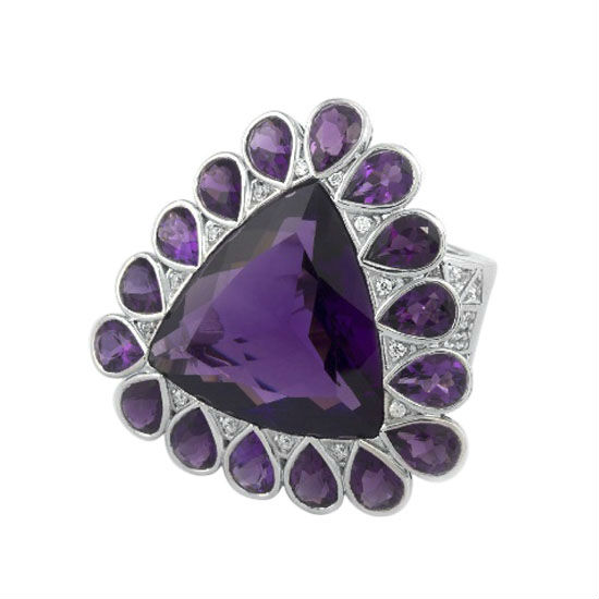 Dazzling ring, rhodium plated, combining beautiful purple amethyst stones and diamonds. Rows of diamonds circling the band to give it the complete glamorous feeling. Combine this ring with the paired necklace for a extra glamorous look. This setting also comes in emerald and sapphire.