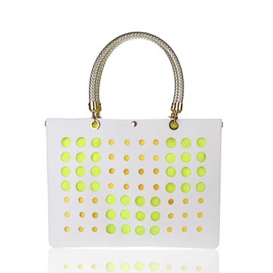 This DB mixture plastic handbag grabs ladies' attention with its trendy and chic appearance. It is designed in pure white with green and yellow elements for a unique touch. The shiny metal handles make this bag look more elegant and fashionable.