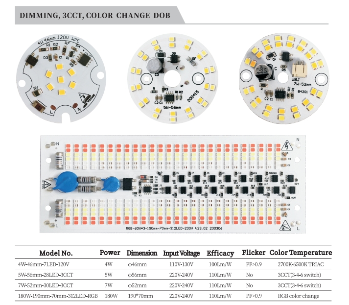 | 4W-46mm-7LED-120V | 4W | φ46mm | 110V-130V | 100Lm/W | PF>0.9 | 2700K-6500K TRIAC |