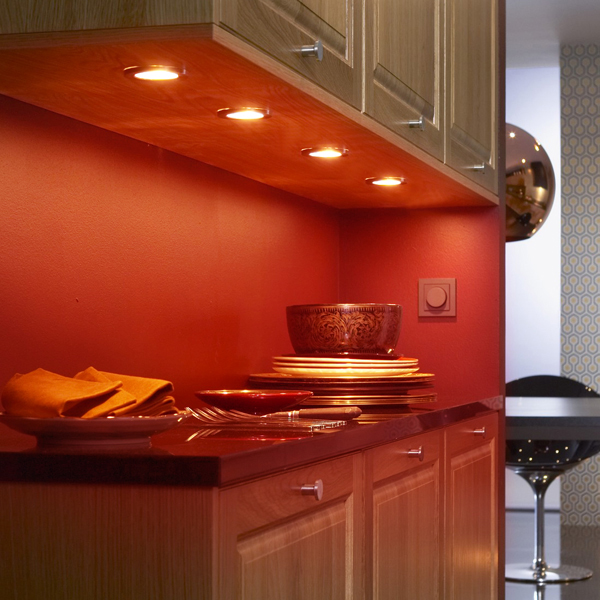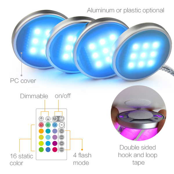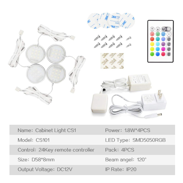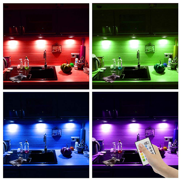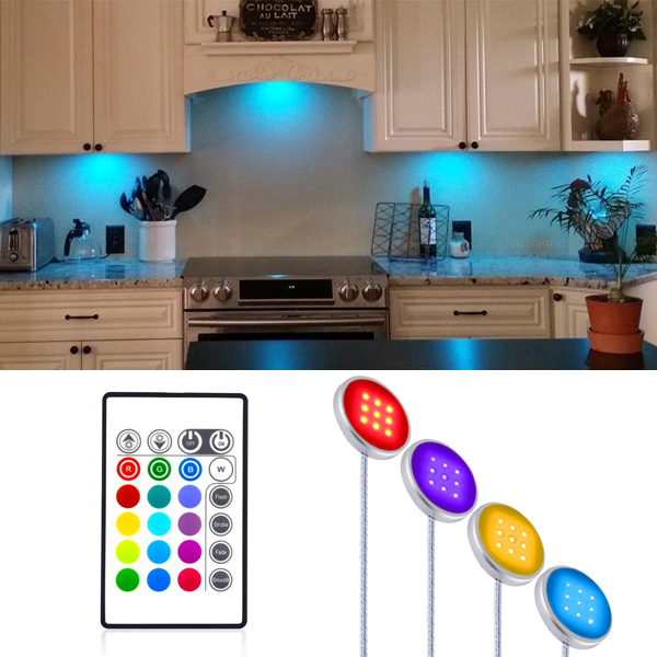 Featured is a DIY cabinet light set that comes with four small LED lights. Installation is incredibly easy, allowing you to customize your desired lighting effect. It is easy to control the color of your lights with the remote controller.