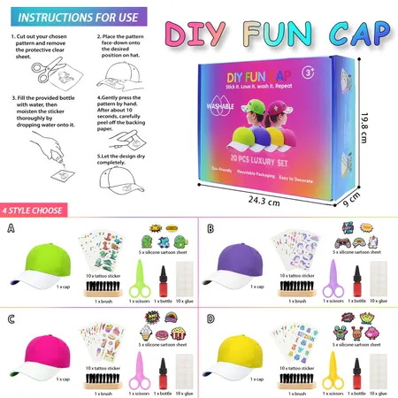 Add some creativity to your hat! The DIY FUN CAP set allows you to easily create a unique personalized hat. Each set includes a hat, a brush, scissors, a bottle, and adhesive tape, and comes with tattoo stickers or silicone cartoon pieces to match the style. All the necessary tools are included in one package.