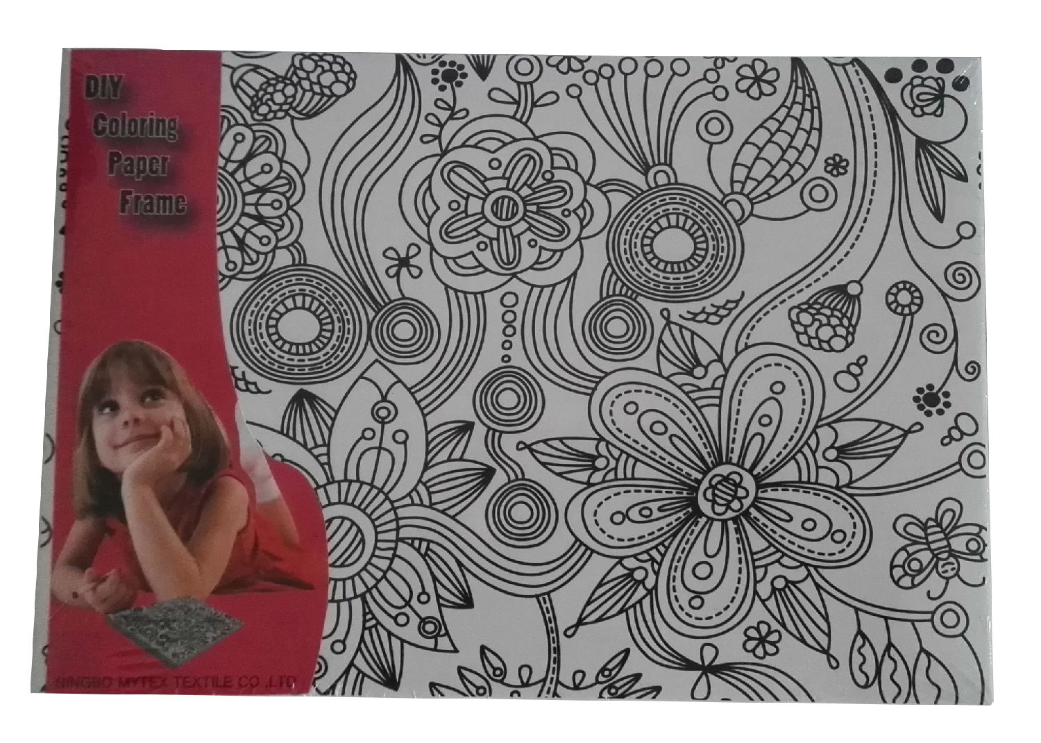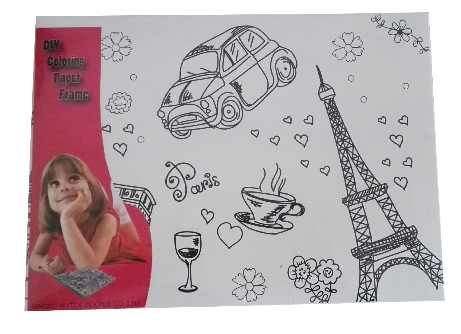 It is made of paper, there are some black line one the frame, the kids can draw it, and color it.