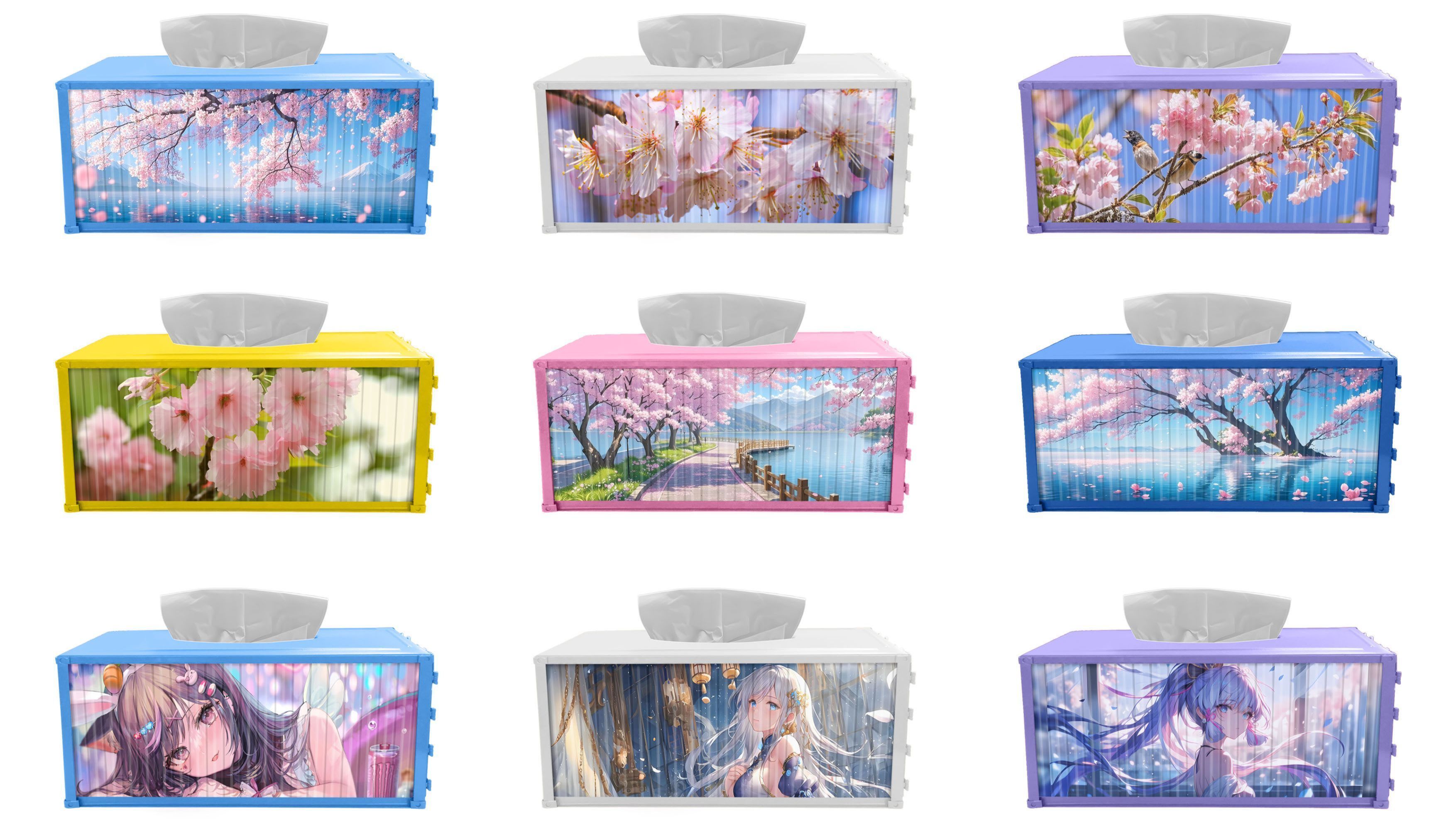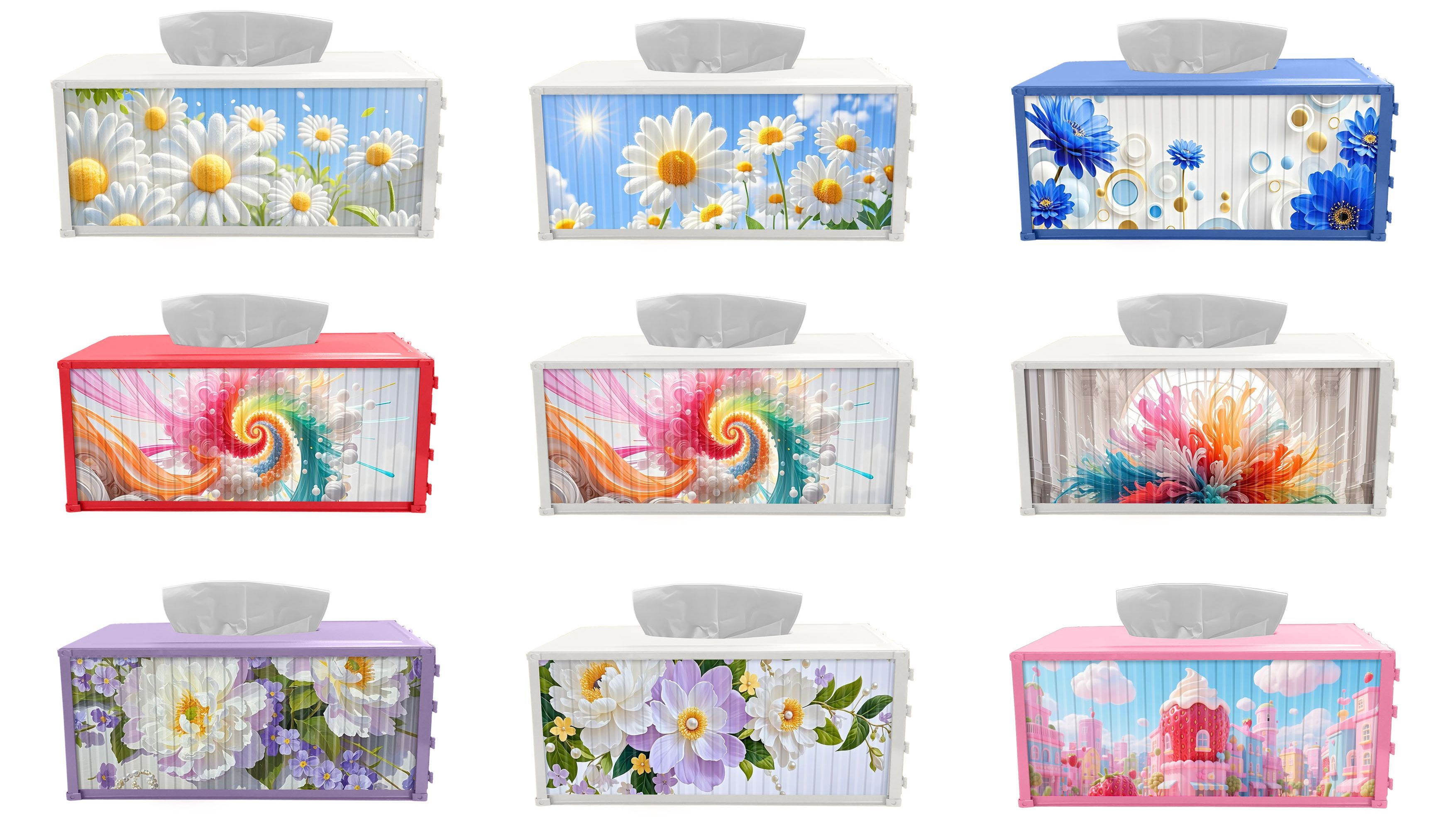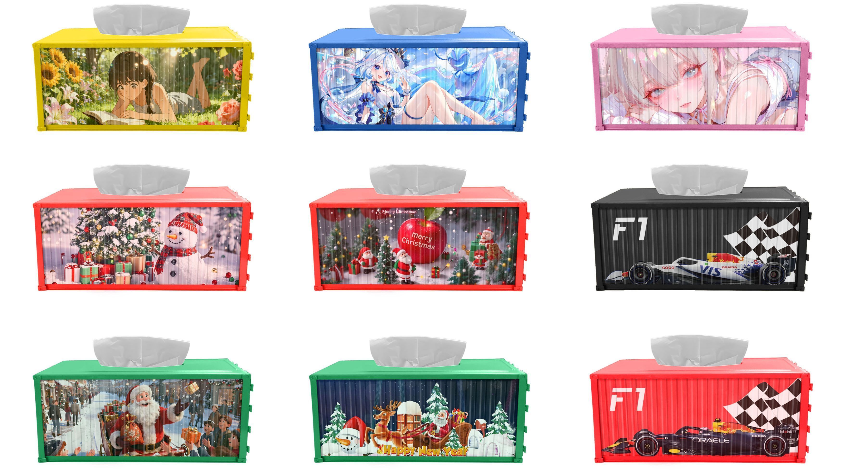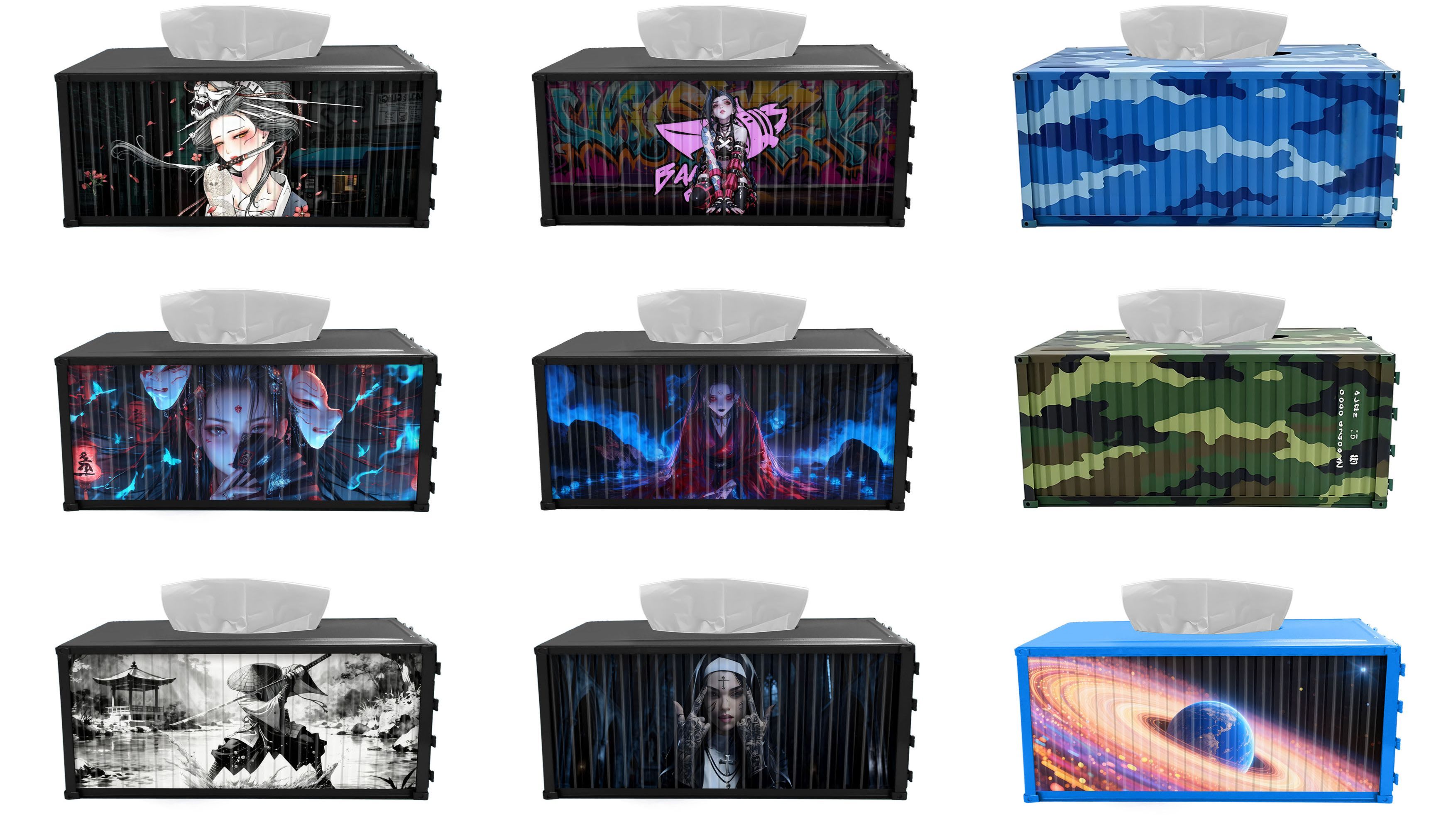 This shipping container-shaped tissue box is designed with convenience and customization in mind.