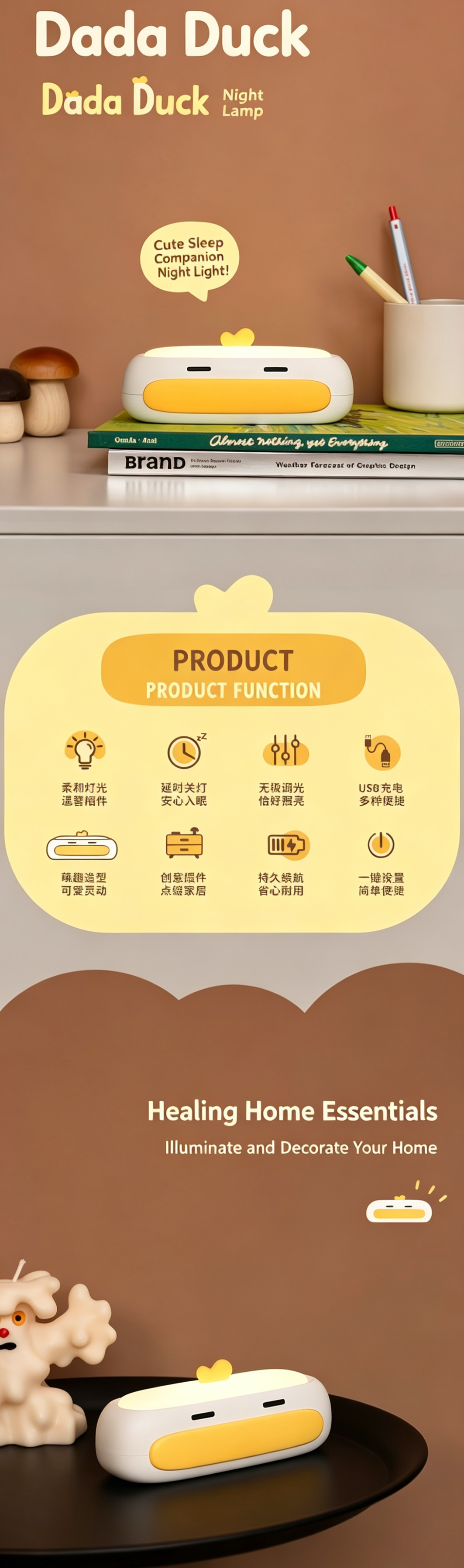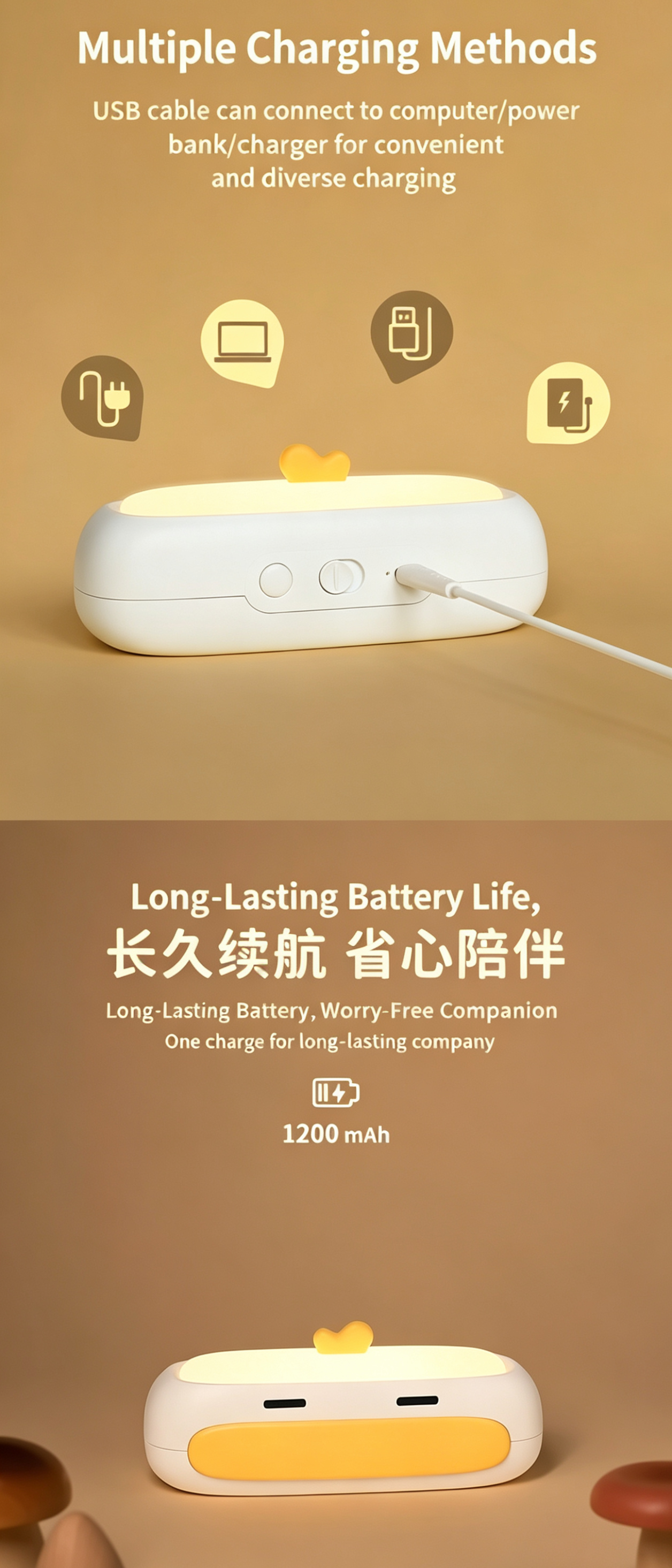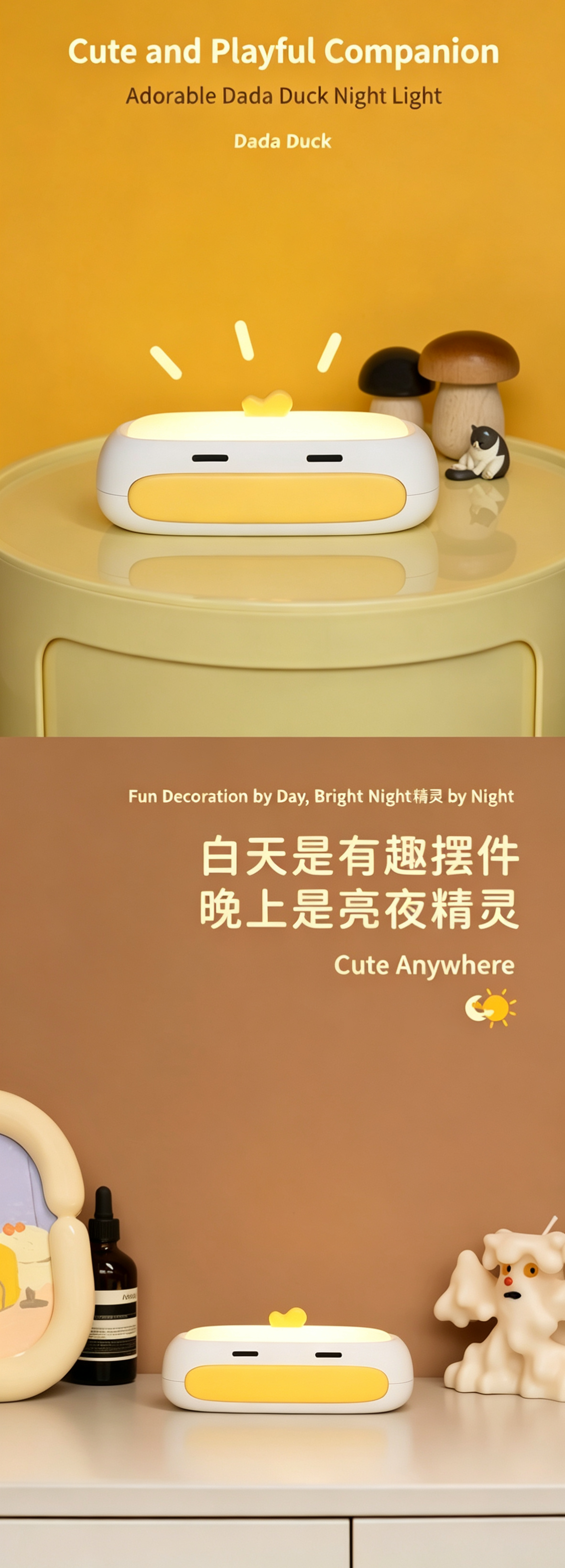 The Dada Duck Night Light is a cute, functional companion for bedtime and home decor. It features stepless dimming, 30/60 mins auto-off timer, and one-key operation for easy use. With a 1200mAh rechargeable battery and USB Type-C charging, it offers long-lasting, convenient power. Its soft warm light is gentle on eyes, perfect for nurseries, bedrooms, or desks, while the playful duck design adds a charming touch to any space.