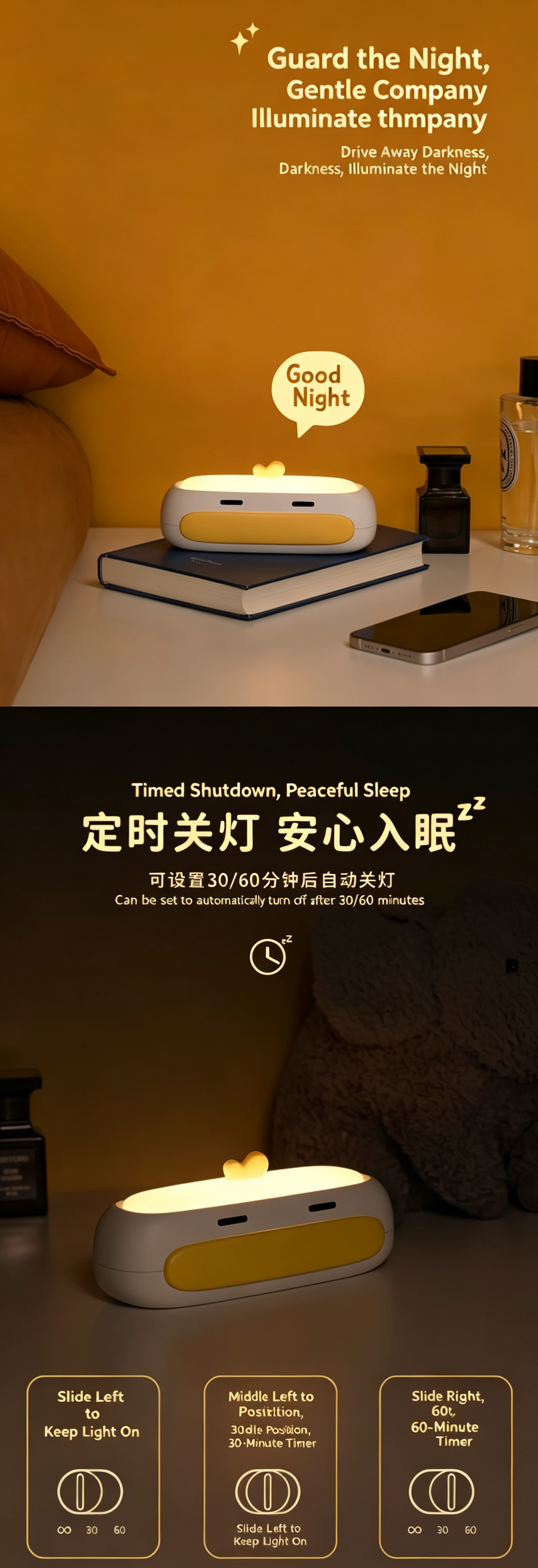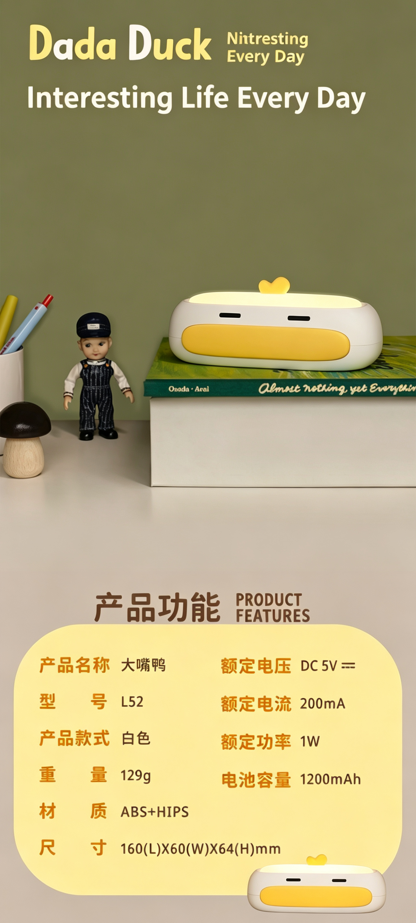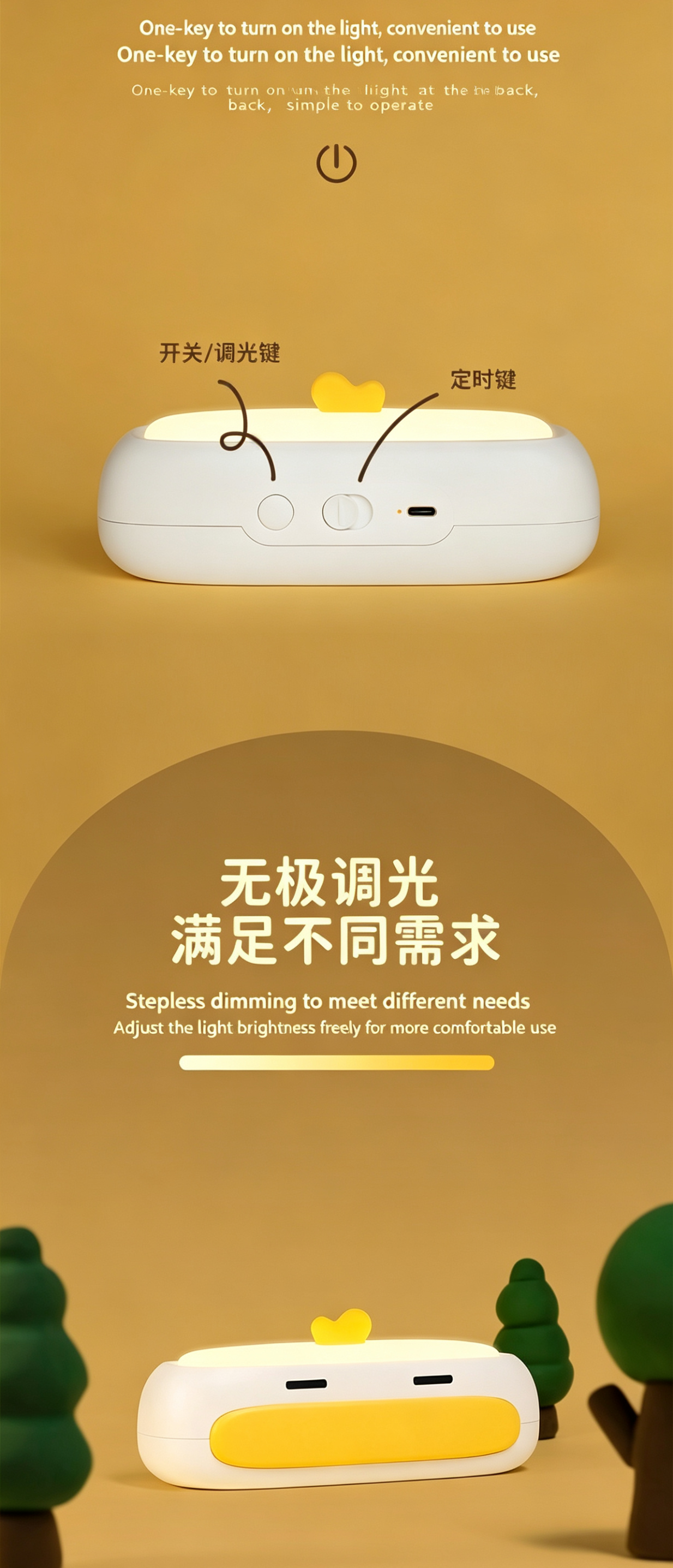 The Dada Duck Night Light is a cute, functional companion for bedtime and home decor. It features stepless dimming, 30/60 mins auto-off timer, and one-key operation for easy use. With a 1200mAh rechargeable battery and USB Type-C charging, it offers long-lasting, convenient power. Its soft warm light is gentle on eyes, perfect for nurseries, bedrooms, or desks, while the playful duck design adds a charming touch to any space.
