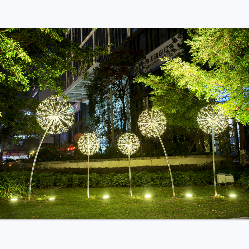 材质:201不锈钢五金件,主极Ǿ76条纹管,PC注塑蒲公英花瓣,LED恒光源或RGB,户外静电喷涂