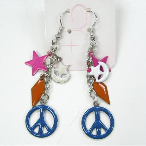 An iron link chain adorned with rhodium plated charms dangles down a fish hook backing. These drop earrings feature a blue peace sign and other embellishments with rich variety. The color epoxy charms add a range of hues to the silver-tone chain making these earrings a lively piece.