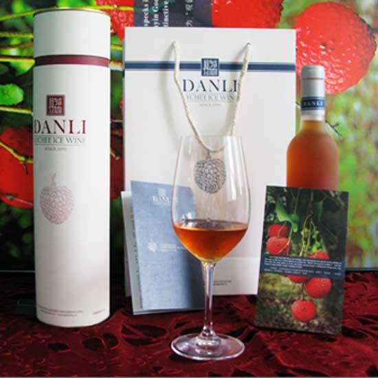 Displayed is a Danli ice wine made with professional procedures. Made from fresh pure lychee, this ice wine offers a unique sweetness and smooth texture. This wine comes in an elegant packaging.