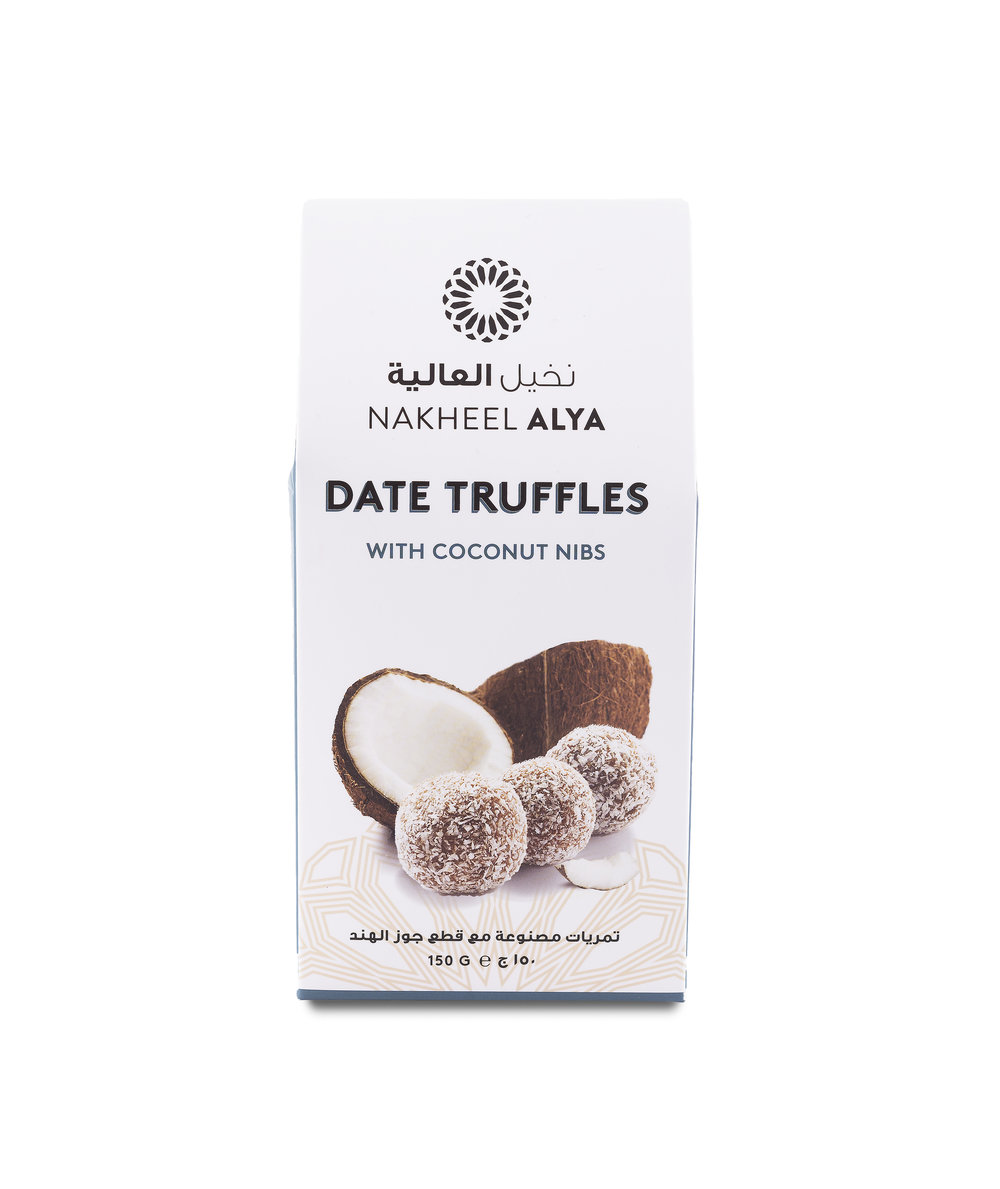 Date truffles in 5 different flavors, chocolate, coconut, sesame, mocha, and cinamon.