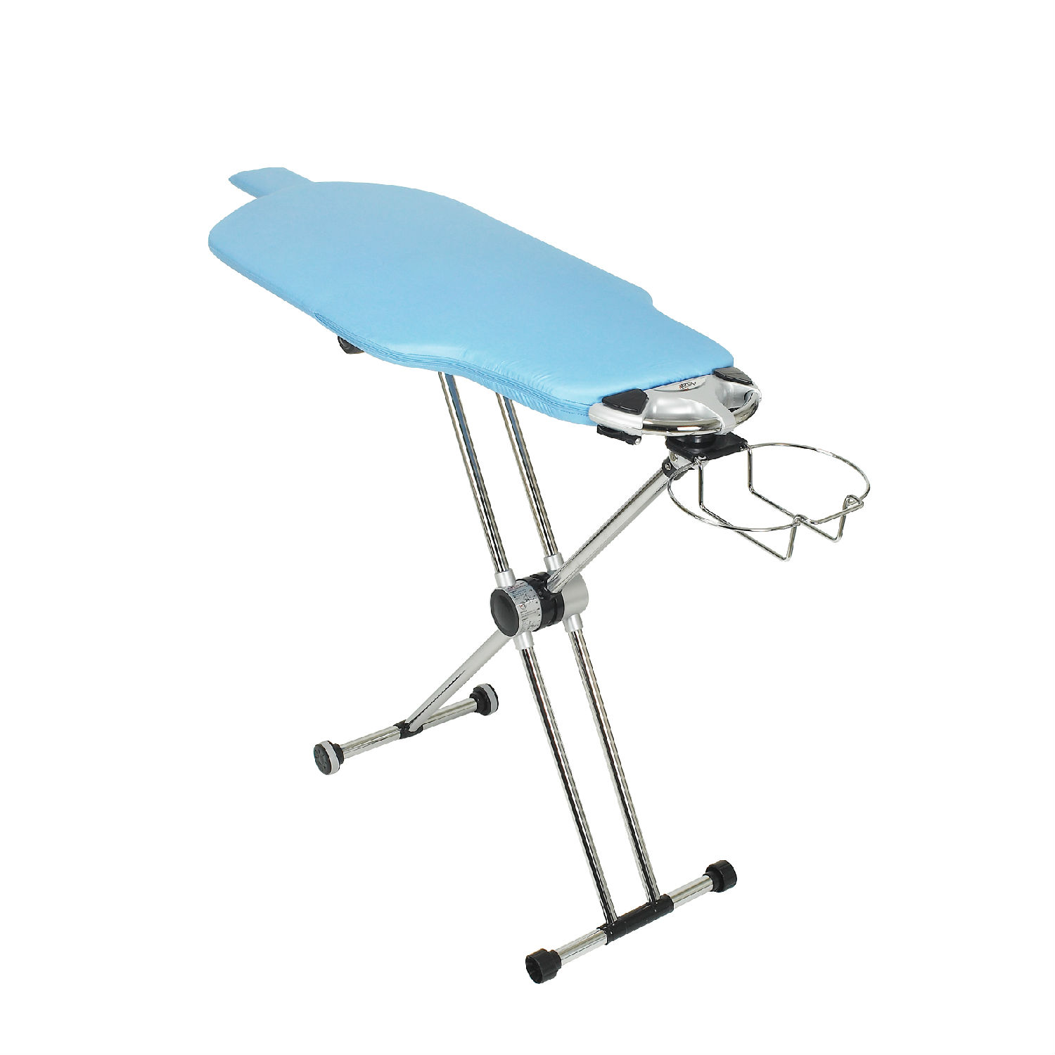 This innovative ironing system features both curved and flat sides, special pants clip, detail board for neck and sleeve, 360 pivoting iron caddy, (8) height adjustments levels and EZ lock mechanism for convenient folding and storage