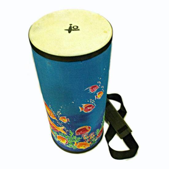 This is a traditional congetto decorated with a tropical ocean theme with a cloth surface. It features a long cylindrical body and is attached with a strap for carrying. The drumhead is made of goat skin, offering a clear sound. It makes a great performing instrument.