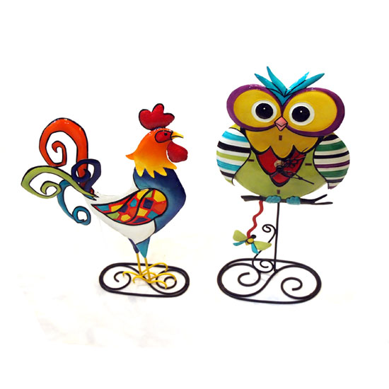This Capiz shell decoration set vividly features the design of a chicken and owl in brilliant colors. Designed with a dial and two watch hands, the owl decoration is also a desktop clock. The elegant steel wire base completes the style of these decorations.