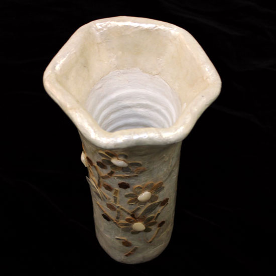 The vase here is crafted with a tall body and a bell-shape mouth. The terracotta material features a natural rough texture. The flower patterns on the vase are formed by polished shells to harmonize with the natural design.