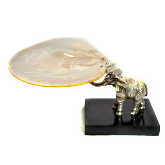 This elegant dish comes with a round pearl plate and a silver-plated elephant decoration. The finely made brass elephant holds the pearl dish to form a special appearance. With a broad square base under the elephant, the dish can act as a stunning decoration.
