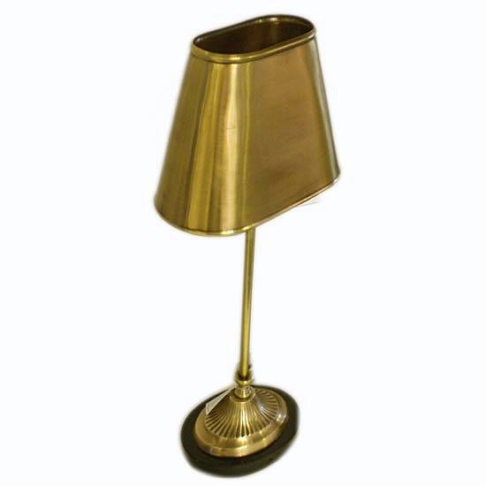 This is a table lamp with a sturdy metal construction. It boasts a bell lampshade and an oval lamp base. The sleek, golden design adds a touch of luxurious glamor. This glorious table lamp makes a great item to add a new dimension to the decor setting of your home.