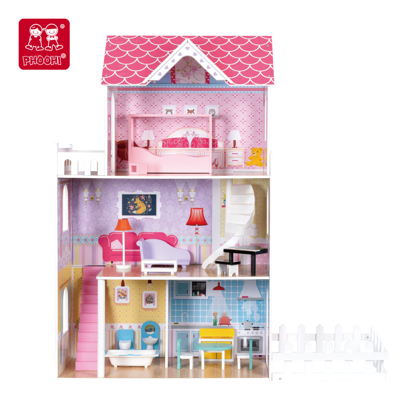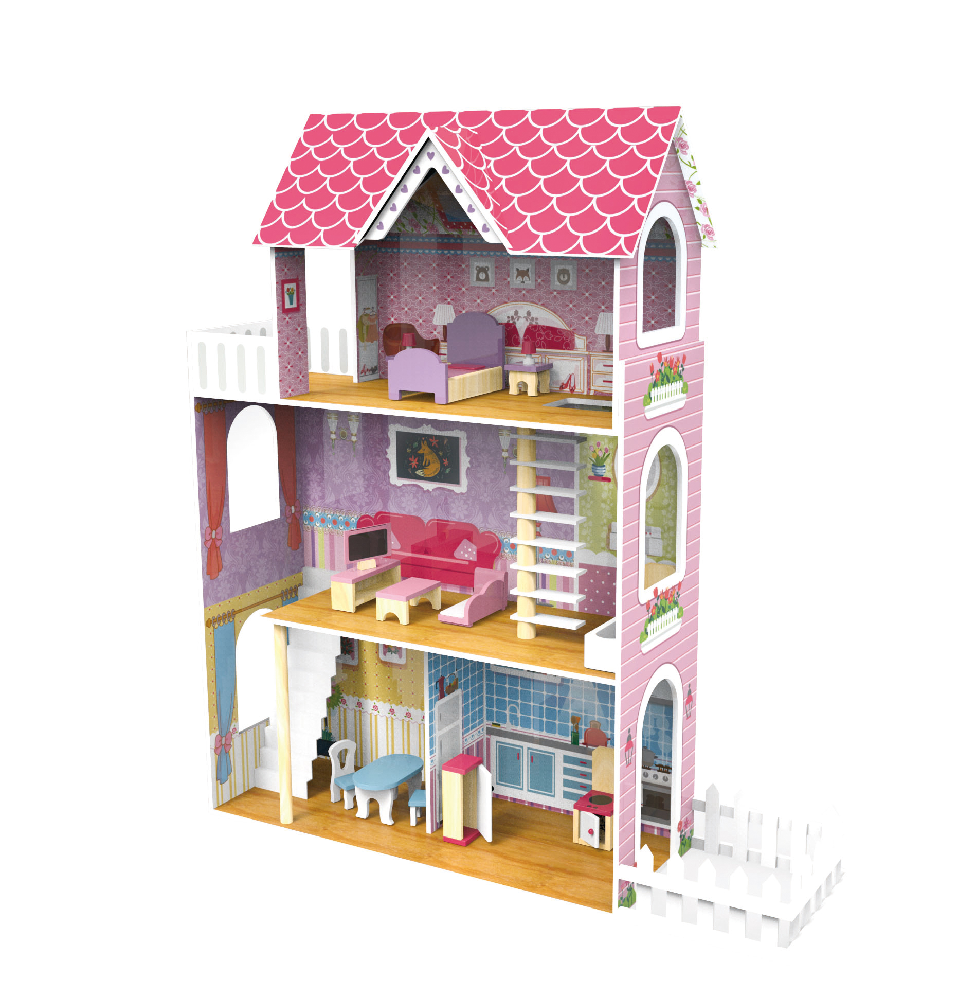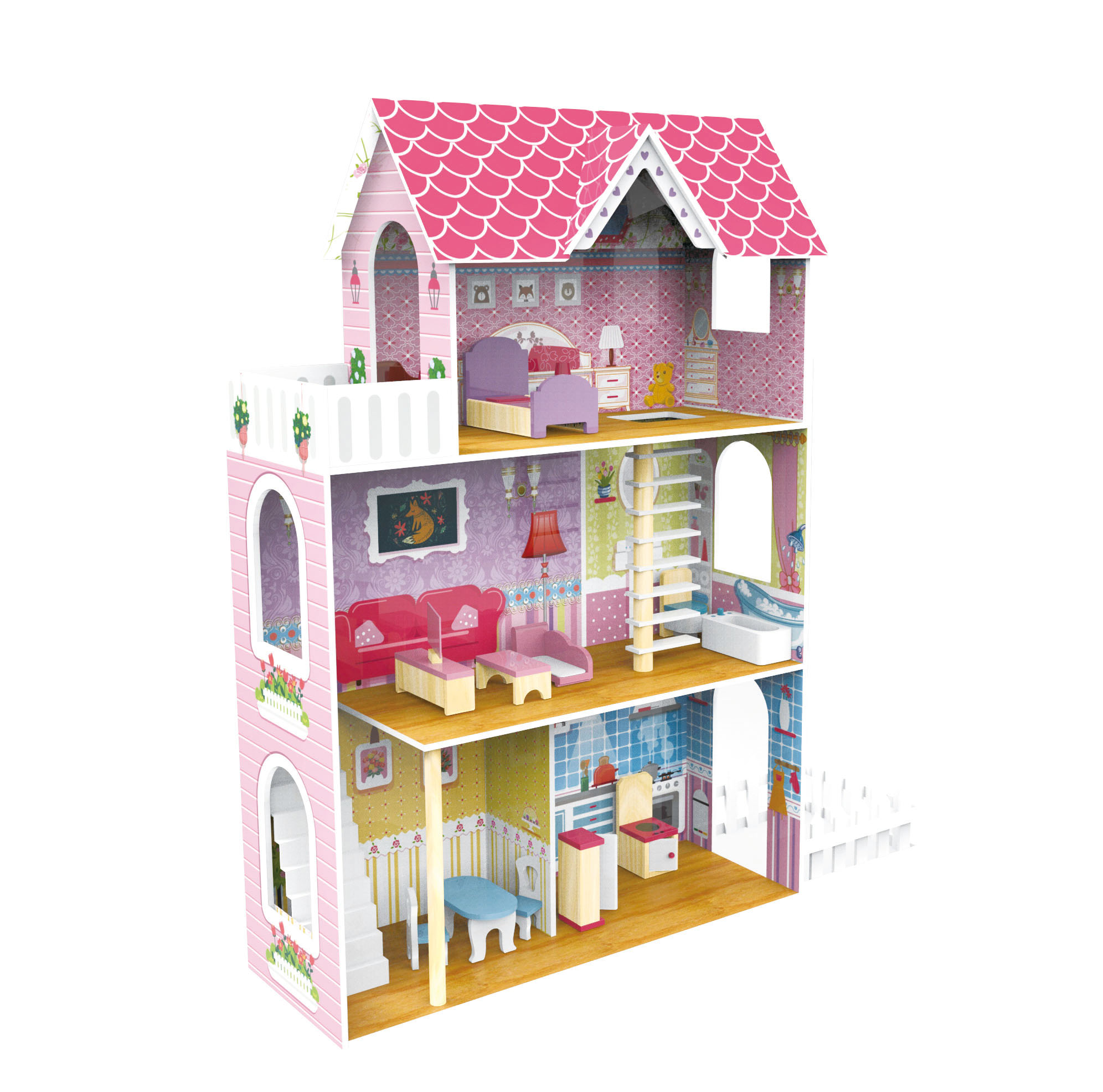 The dollhouse includes miniature furniture and accessories that allow for a diverse variety of scenes and scenarios, from the lavishly designed living room to the cozy bedrooms, the chic kitchen to the splendid bathroom. Thoughtfully constructed with high-quality, kid-friendly materials for robust durability and added safety, this adorable doll house is an ideal toy that helps teach kids about shape, color, number, time, and so on.
