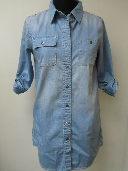 Denim items never go out of style. This ladies’ blouse is finished in stone enzyme wash in a pale blue tone. It features a shirttail hemline, long length design and long roll-tab sleeves for added style. Made of whole cotton, it ensures easy matching in comfortable way. This versatile blouse is surely a relaxed staple for your wardrobe.