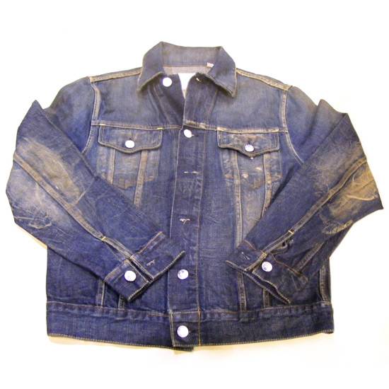 This denim jacket has a standing collar with buttons for closure. It is suitable to wear in autumn or winter for warm. It is in blue color and also with some yellow brown to make a worn-out appearance which looks stylishly.