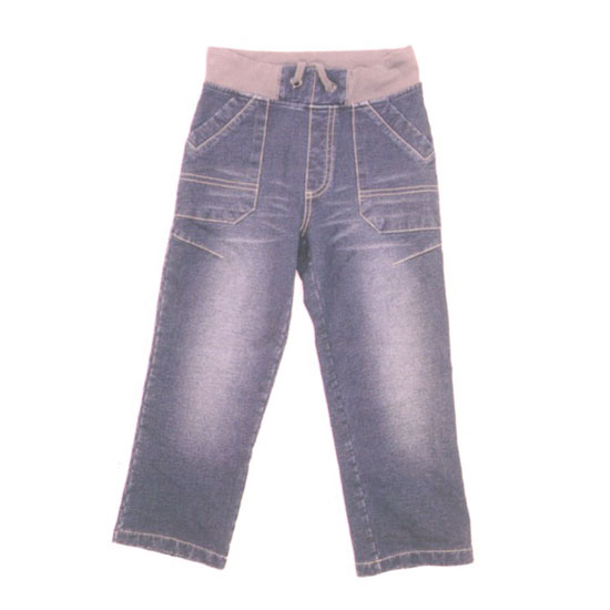 This is a pair of denim pants in blue with washing effects. Its waistband boasts an embedded design for added uniqueness. This pair of pants goes well with different kinds of tops.