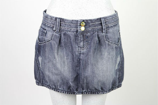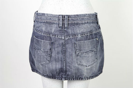 - The featured denim skirt is fashioned with and whiskering at the thighs which further enhance the vintage style.