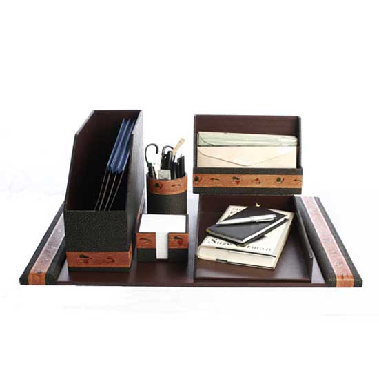 The desk accessory set includes a file holder, a desk blotter, a letter holder, a file tray, and a pen holder. All items are exquisitely crafted with paperboard, which provides enhanced sturdiness for long-time use. The down-to-earth color is complemented by subtle patterns, blending into your office decor with a touch of sophistication.
