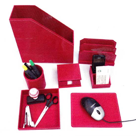 The desk caddy set contains a magazine holder, an envelope holder, a pen cup, a slip box, a mobile holder, an organizer and a mouse pad. They are made of recycled cotton and leather for an environment-friendly design. Keep all your office stationery neat and allow them to be easily accessed with this caddy set.