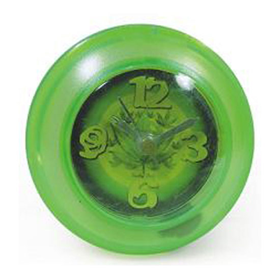 This green desk clock features a neat round design. The dial is decorated with quarter numeral markers and fancy graphics. Clocks with more subtle designs are also available.