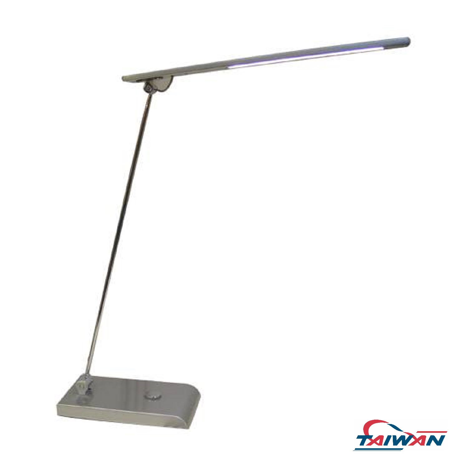 A desk lamp equipped with energy saving light bulb. Made of aluminium with a heavy lamp base. Adjustable arm for different angles of lighting.