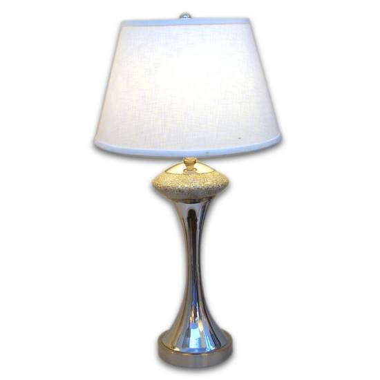 As shown is a desk lamp with an iron base and a glass shade. The base is of high gloss finishing. Glare is avoided by the semi-transparent shade.