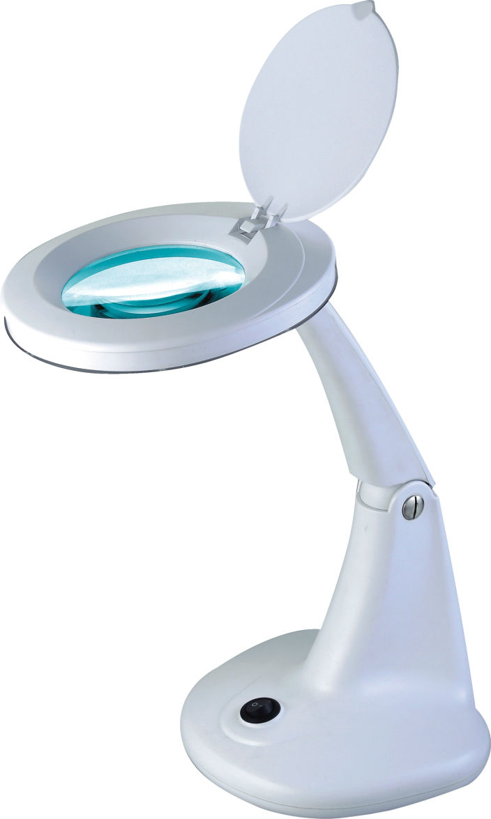 The displayed magnifier light has a round light head with a magnifier lens in the center.It can offer a clear view of small objects. It has an on/off button on the base and has an adjustable arm for light direction control. This magnifier light flaunts an elegant design and can provide bright illumination.