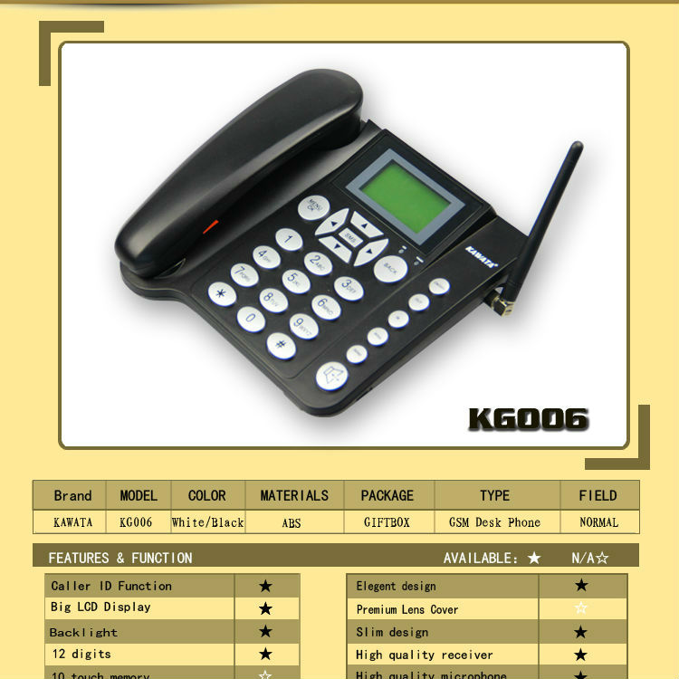 Place of Origin: Guangdong, China (Mainland) Brand Name: KAWATA Model Number: KG-006 Type: VoIP Adapter, GSM Color: black, white as per choice Frequency: Quad band Access to internet: Available Functions: Hand-free, re-dial and call-back functions Dimension:: 200*175*65mm (L*W*H) Packing: Giftbox Standard: FCC, Anatel, CE, Rohs, Reach standard Product name: Gsm Modem Working Frequency: Quad band