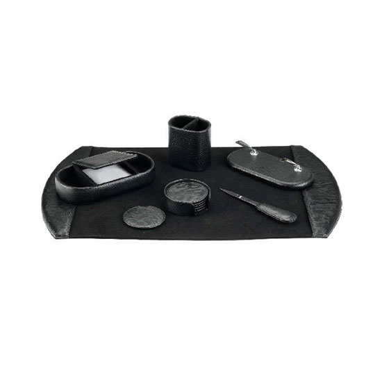 This is a desk set that comes in a classic style. Featuring a single-fold desk pad, this set consists of a pen stand, a memo case, a pencil cup, etc. This useful desk set is ideal for offices.