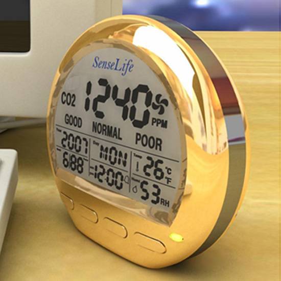 - It measures CO2 levels, relative humidity temperature, and also shows the date.