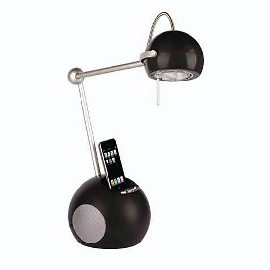 This stylish table lamp has an angle-adjustable arm and a dome-shaped base. It is equipped with an iPod docking station and 2 quality built-in speakers. The lamp does not only provide good illumination but also offers excellent sound quality for music broadcasting.