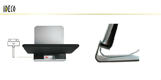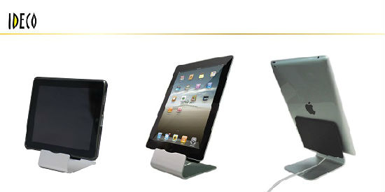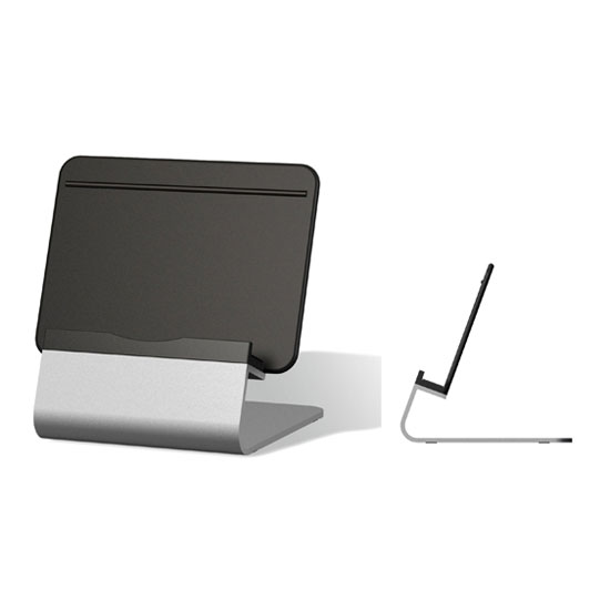 This desktop iPad stand features a minimalist and elegant design. It provides optimal viewing in landscape or portrait positions. The iPad stand is designed with a center charging hole for convenient use.
