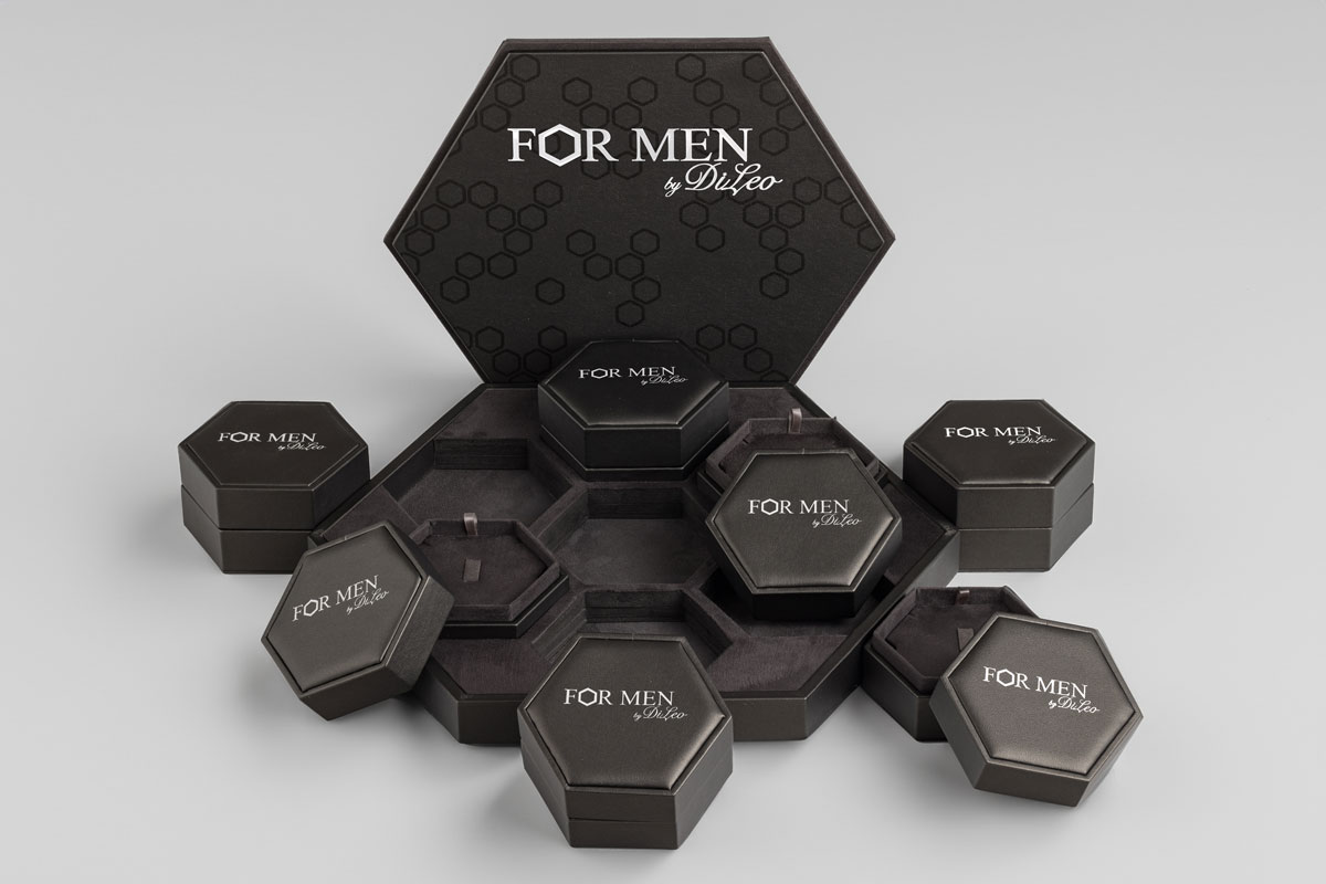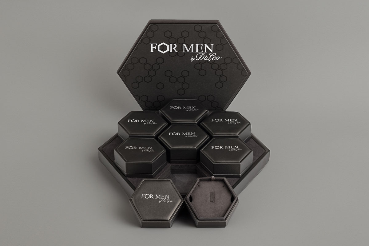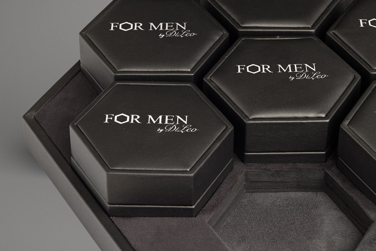 The design is inspired by hexagonal cells, typical of the honeycomb, covered in microfibre and dark grey leatherette. For Men is a men's collection waiting to be discovered.
