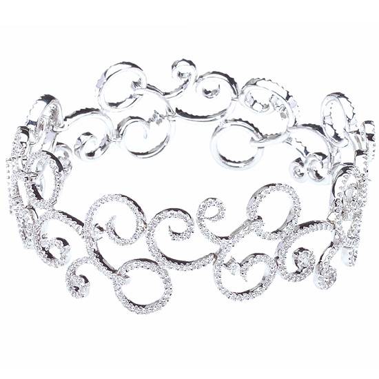 This diamond bangle is in openwork design with scrolls. The diamonds are in beat setting which are glittering and can attract people's attention. Its scroll patterns with clear and transparent diamonds make the wearer elegant.