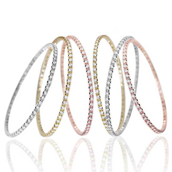 The diamond bangles feature a slim and chic style. They are plated in a fresh combination of white, yellow and pink. Diamonds are set on the slim bands to bring out beautiful shine.