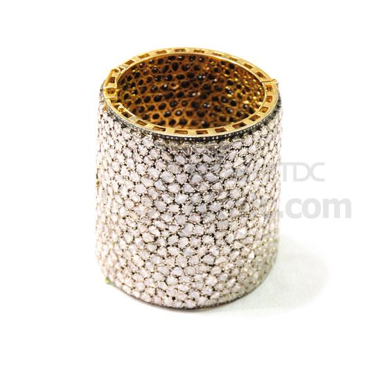 This tube-shaped bangle is paved with tiny white diamonds on the extra wide band. Set in gold and silver, the bracelet showcases a highly polished finish. The diamond bangle makes an eye-catching addition to any jewelry collection.