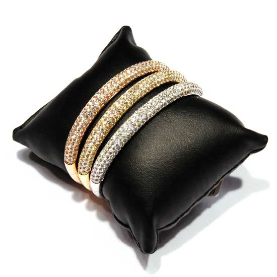 Showcased are three diamond bangles crafted with 18K gold, 18K white gold, and yellow rose gold. They are encrusted with high-quality diamonds to give a sparkling touch. Embellish your wrist with these bangles.