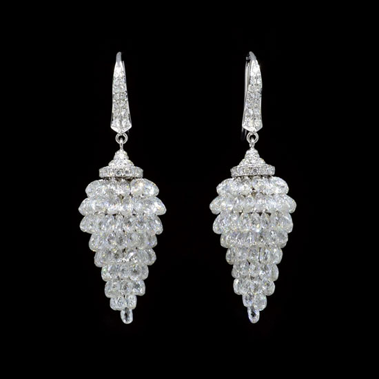 This is a pair of diamond briolette earrings in an 18K gold setting. The design of the earrings is inspired by the shape of the pine cone. They