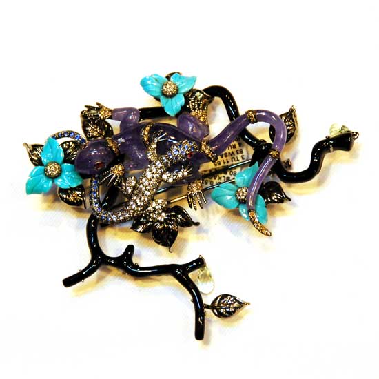 Highlighted is a diamond brooch luxuriantly adorned with a jade lizard and blossoms. The black onyx in the appearance of twigs showcases added exquisiteness. This gorgeous brooch makes a charming complement for your evening dress.