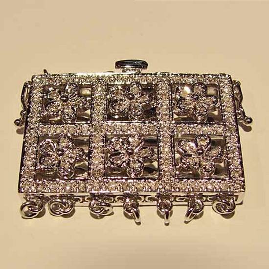 This is a clasp for 4 or 7 strands. It is especially suitable for multi-stranded pearl necklaces. It features flowery patterns and small dazzling diamonds.