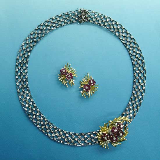 This diamond collar is finely made with great craftsmanship and delicate details. It comes with a ruby brooch and a pair of matching earrings. This diamond collar will surely make you stand out from the crowd.